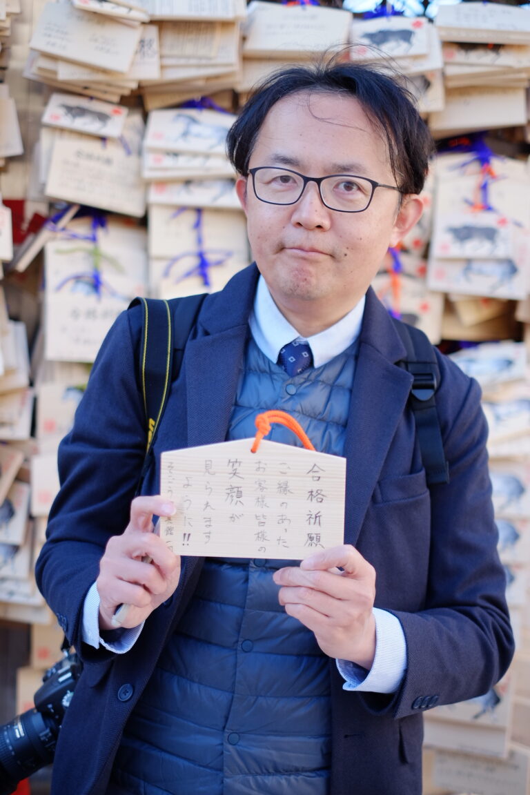 横浜店店長、「より高いところを合格して欲しい」との思いを込めて、自分の背で届くいちばん高い場所に毎年奉納をしております。