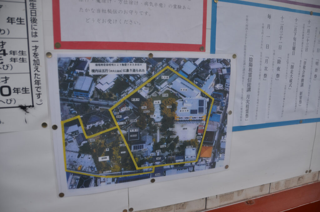 境内は 正五角形(五方=東西南北と中央) を基本にした特異な構造で、陰陽道・五行思想(木火土金水)と深く結びついています。