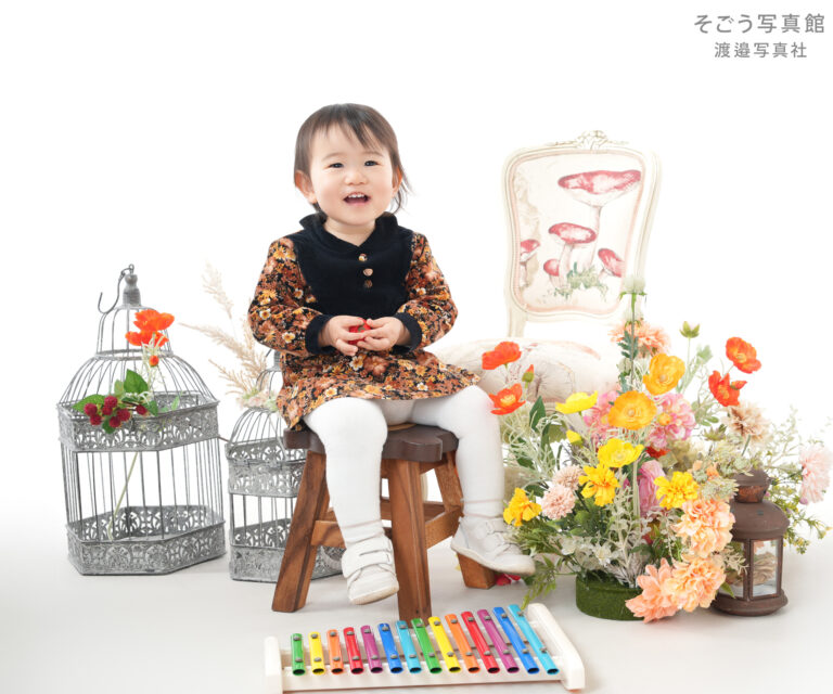 カラフルな木琴を前に、少しはにかんだような優しい笑顔を見せてくれました。お嬢様の穏やかで可愛らしい雰囲気が、お写真いっぱいに広がっています♩