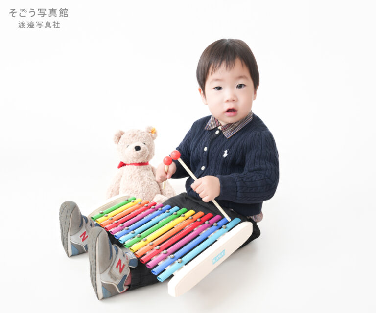 カラフルな木琴の後ろには、優しく見守るテディベアの姿も。まるでお部屋でお気に入りの楽器を演奏しているような、自然体で魅力的なカットになりました✨