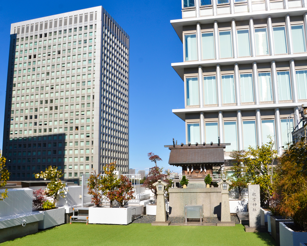 新橋のビル街の中、航空会館ビルの9階にある神社になります。9階も会議室などオフィスが入っていて、本当に神社があるのか不安になりましたが屋外につながる扉を発見。