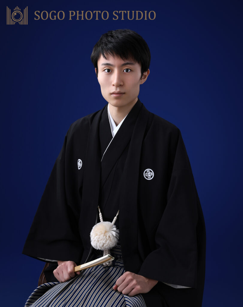 椅子に座ったポーズも大変人気なポーズです。紺色の背景で袴がさらに際立ちます✨