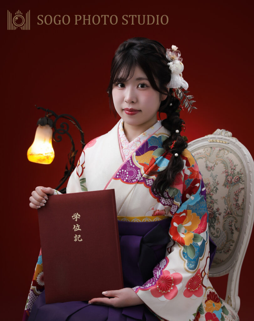クラシカルな雰囲気のお写真をご希望していただき、ランプを使って撮影させていただきました。学位記の色と合わせた赤背景でシックに🌸